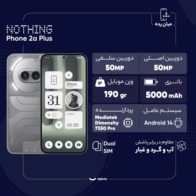 باتری 5000 میلیآمپرساعتی با شارژ سریع 50 وات، این گوشی را به گزینهای ایدهآل برای استفاده طولانیمدت تبدیل کرده است. در مجموع اگر به دنبال یک گوشی با طراحی منحصر به فرد، عملکرد قدرتمند و دوربین با کیفیت هستید، Nothing Phone 2a Plus یکی از جذابترین گزینهها برای شماست.