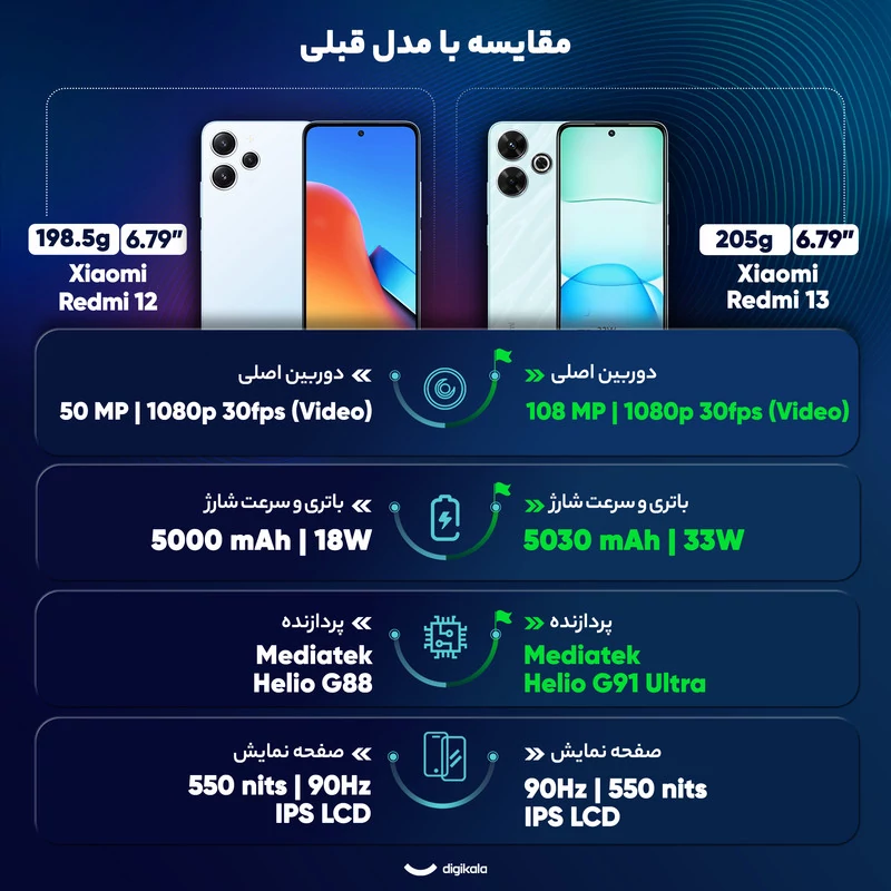 گوشی موبایل شیائومی مدل Redmi 13 محصولی مقرون به صرفه با قابلیتهای چشمگیر در رده میانردهها است. این گوشی با نمایشگر 6.79 اینچی IPS LCD و رزولوشن Full HD+، تجربه بصری خیرهکنندهای را ارائه میدهد. نرخ نوسازی 90 هرتز، روان بودن حرکات را تضمین میکند. تراشه MediaTek Helio G91 Ultra به همراه هشت هسته پردازنده، قدرت پردازشی مناسبی برای اجرای اپلیکیشنها و بازیها فراهم میکند. دوربین اصلی 108 مگاپیکسلی با قابلیت فوکوس خودکار این گوشی، عکسهای واضح و با جزئیات بالا را به شما هدیه میدهد. دوربین ماکرو دو مگاپیکسلی نیز برای عکاسی از سوژههای نزدیک مناسب است. دوربین سلفی 13 مگاپیکسلی موجود در گوشی برای عکاسی خودنگاره مناسب است. باتری 5030 میلیآمپر ساعتی با پشتیبانی از شارژ سریع 33 واتی، شارژدهی طولانیمدتی را فراهم میکند. این گوشی با دو سیمکارت و حافظه داخلی 256 گیگابایت و رم هشت گیگابایت عرضه میشود که امکان افزایش آن با کارت microSD نیز وجود دارد. این گوشی با طراحی زیبا، وزن 205 گرمی و ضخامت 8.3 میلیمتری، انتخابی مناسب برای کاربران جویای یک گوشی کارآمد و خوشقیمت است. همچنین این نسخه مجهز به فناوری ارتباطی NFC است.