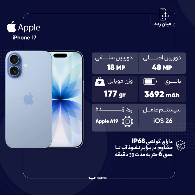 آیفون ۱۷ تازهترین پرچمدار اپل است که با ترکیب طراحی زیبا، نمایشگر ارتقایافته و سختافزار قوی، تجربهای کاملتر از همیشه را ارائه میدهد. اپل با باریکتر کردن حاشیهها، نمایشگر ۶.۳ اینچی Super Retina XDR LTPO OLED را در بدنهای جمعوجور جای داده است. این نمایشگر نرخ نوسازی تطبیقی ۱۲۰ هرتز، روشنایی خیرهکننده ۳۰۰۰ نیت و پوشش ضدانعکاس دارد و حتی در زیر نور مستقیم خورشید مشکلی برای تماشای محتوای صفحه نمایش نخواهید داشت. قابلیت Always-On Display نیز برای نخستینبار در نسخه غیر Pro در دسترس کاربران قرار گرفته است. در بخش طراحی، اپل از آلومینیوم بازیافتی و پوشش مقاوم Ceramic Shield 2 استفاده کرده که نسبت به نسل قبل سه برابر مقاومت بیشتری دارد. این گوشی در پنج رنگ جذاب عرضه میشود و با وزن مناسب، کاربری روزمره را آسان میسازد. دوربینهای دوگانه ۴۸ مگاپیکسلی آیفون ۱۷ شامل لنز عریض و فوقعریض ارتقایافتهاند که جزئیات خیرهکننده، دامنه داینامیکی وسیع و قابلیت عکاسی ماکرو را ارائه میدهند. فیلمبرداری 4K با Dolby Vision و حالتهای Cinematic و Action Mode آن را به ابزاری حرفهای برای تولید محتوا تبدیل کرده است. دوربین سلفی نیز با سنسور جدید و قابلیت Center Stage به سطحی تازه ارتقا یافته است. قلب تپنده دستگاه، تراشه ۳ نانومتری A19 است که با قدرت پردازشی بالا، پشتیبانی از Ray Tracing و رم ۸ گیگابایتی، تجربهای سریع و روان را تضمین میکند. عمر باتری تا ۳۰ ساعت پخش ویدئو ادامه دارد و با شارژ سریع، تنها در ۲۰ دقیقه به ۵۰ درصد میرسد. پشتیبانی از شارژ بیسیم MagSafe و استاندارد Qi2 هم در دسترس است. در نهایت آیفون ۱۷ انتخابی ایدهآل برای کاربرانی است که به دنبال نمایشگری درخشان، دوربینهای قدرتمند، پردازنده سریع و نرمافزاری هوشمند هستند؛ گوشیای که یکی از کاملترین پرچمداران سال ۲۰۲۵ لقب گرفته است.