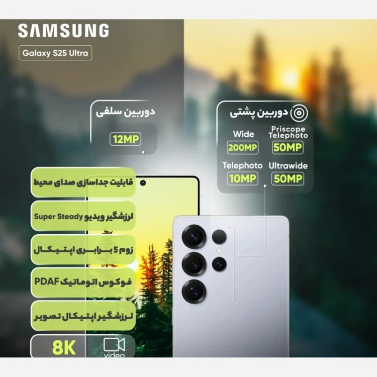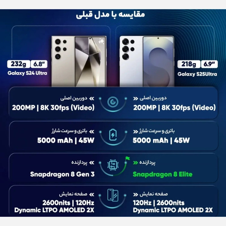 سرانجام سامسونگ به انتظارها پایان داد و پرچمدار جدید خود Galaxy S25 Ultra را به بازار معرفی کرد. این پرچمدار که پس از S24 Ultra که یکی از موفقترین پرچمدارهای تاریخ گوشیهای هوشمند است، به بازار آمده و مسئولیت سنگینی دارد. از لحاظ طراحی، S25 Ultraبا فریم تیتانیوم درجه 5 و گوریلا گلس آرمور 2 ساخته شده است که به آن دوام و استحکام فوقالعادهای بخشیده است. ابعاد دستگاه به اندازهای است که در دست گرفتن آن راحت است و لبههای خمیده و وزنی معادل 218 گرم باعث شده است که این گوشی از S24 Ultra خوشدستتر باشد. این گوشی همچنین با استاندارد IP68 مقاوم در برابر آب و گرد و غبار است، بنابراین میتوانید بدون نگرانی از آن در شرایط مختلف استفاده کنید. نمایشگر S25 Ultra یک صفحه Dynamic LTPO AMOLED 2X با سایز 6.9 اینچ و رزولوشن بسیار بالا است که تصاویر فوقالعاده شفاف و رنگهای زندهای را به نمایش میگذارد. همچنین، این نمایشگر از نرخ تازهسازی 120 هرتز پشتیبانی میکند که باعث میشود همه چیز بسیار روان و سریع به نظر برسد. در دل این گوشی، Snapdragon 8 Elite چیپستی است که سرعت و عملکرد را به سطح جدیدی میبرد. این گوشی با حافظه داخلی مناسب و حافظه رم گسترده، به شما اجازه میدهد بدون هیچگونه تأخیر، از بازیها و برنامههای سنگین لذت ببرید. دوربین اصلی 200 مگاپیکسلی این گوشی به همراه لنزهای تلهفوتو و اولتراواید، تصاویری دقیق و شفاف را ثبت میکند. همچنین، امکان فیلمبرداری 4K با سرعت 120 فریم بر ثانیه یکی از بهترین گوشیهای هوشمند در زمینه فیلمبرداری است. در نهایت، باتری 5000 میلیآمپر ساعتی و شارژ سریع 45 وات، S25 Ultra را به یک انتخاب ایدهآل برای کسانی تبدیل میکند که به دنبال قدرت، کیفیت و طراحی بینظیر در یک گوشی هوشمند هستند.